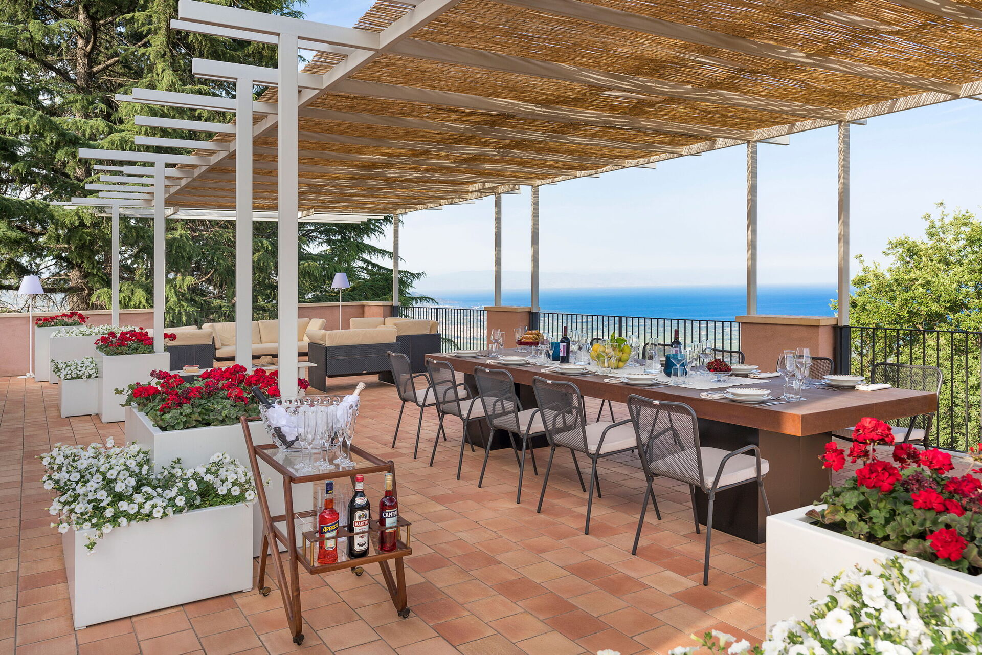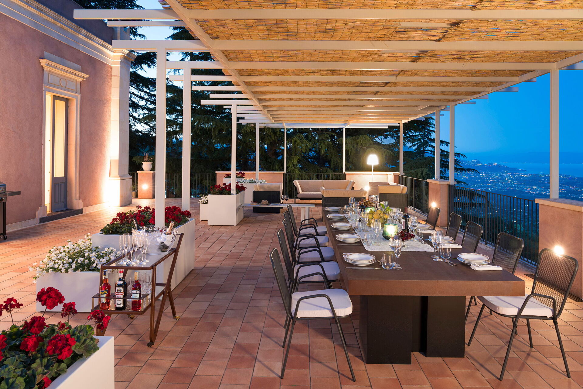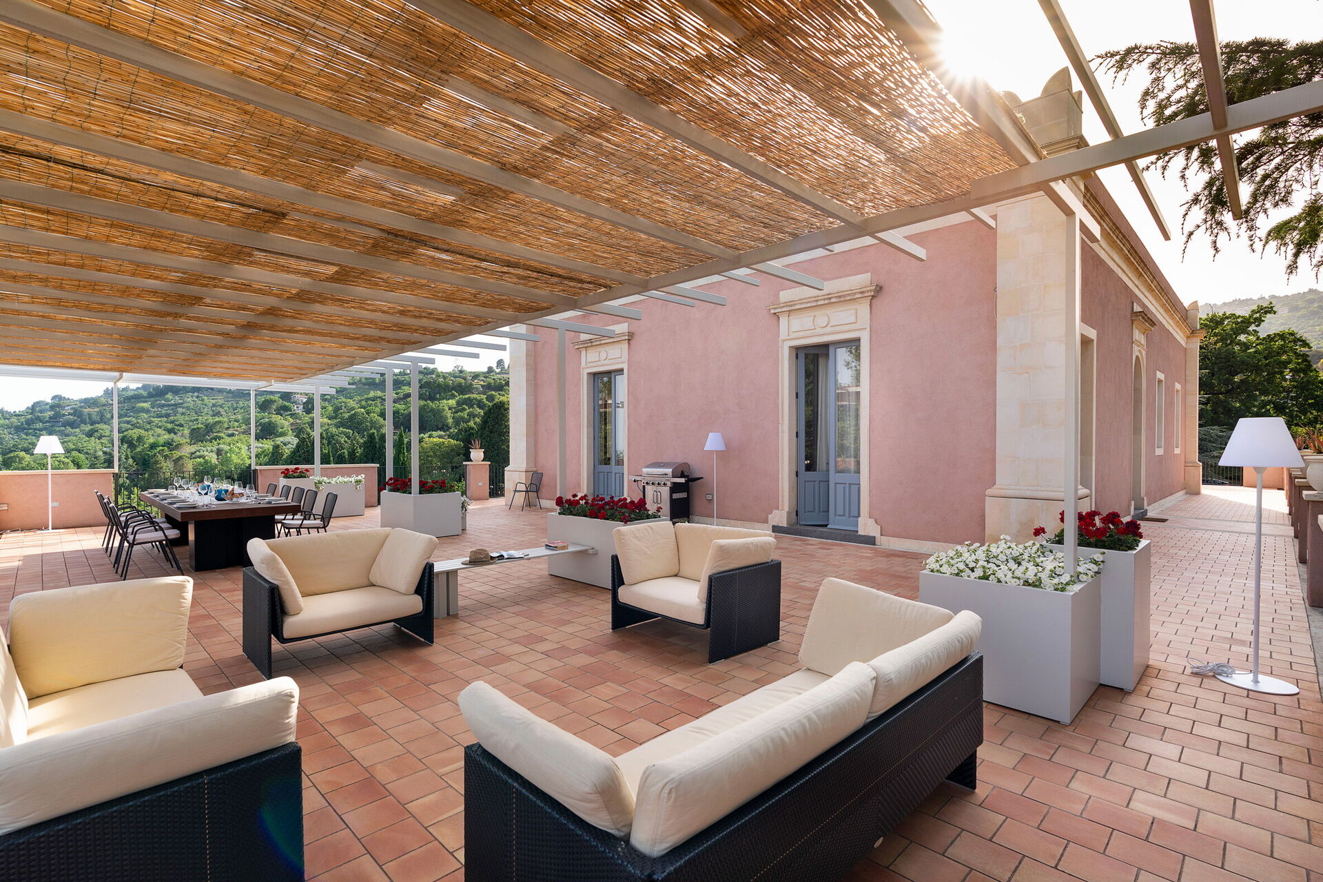 De mange udendørs arealer er perfekte til udendørs spisning, til at nyde en aperitif eller middag på sommeraftener og til at beundre den fantastiske panoramaudsigt.