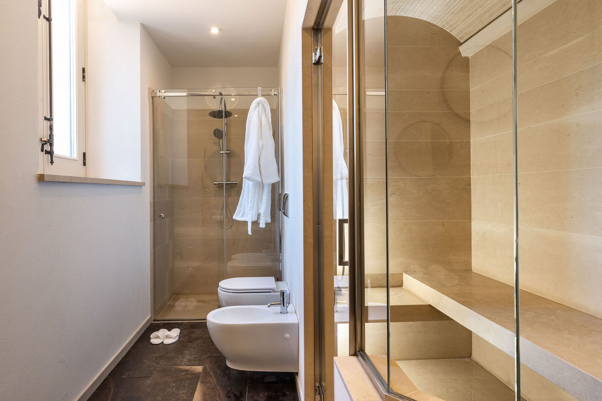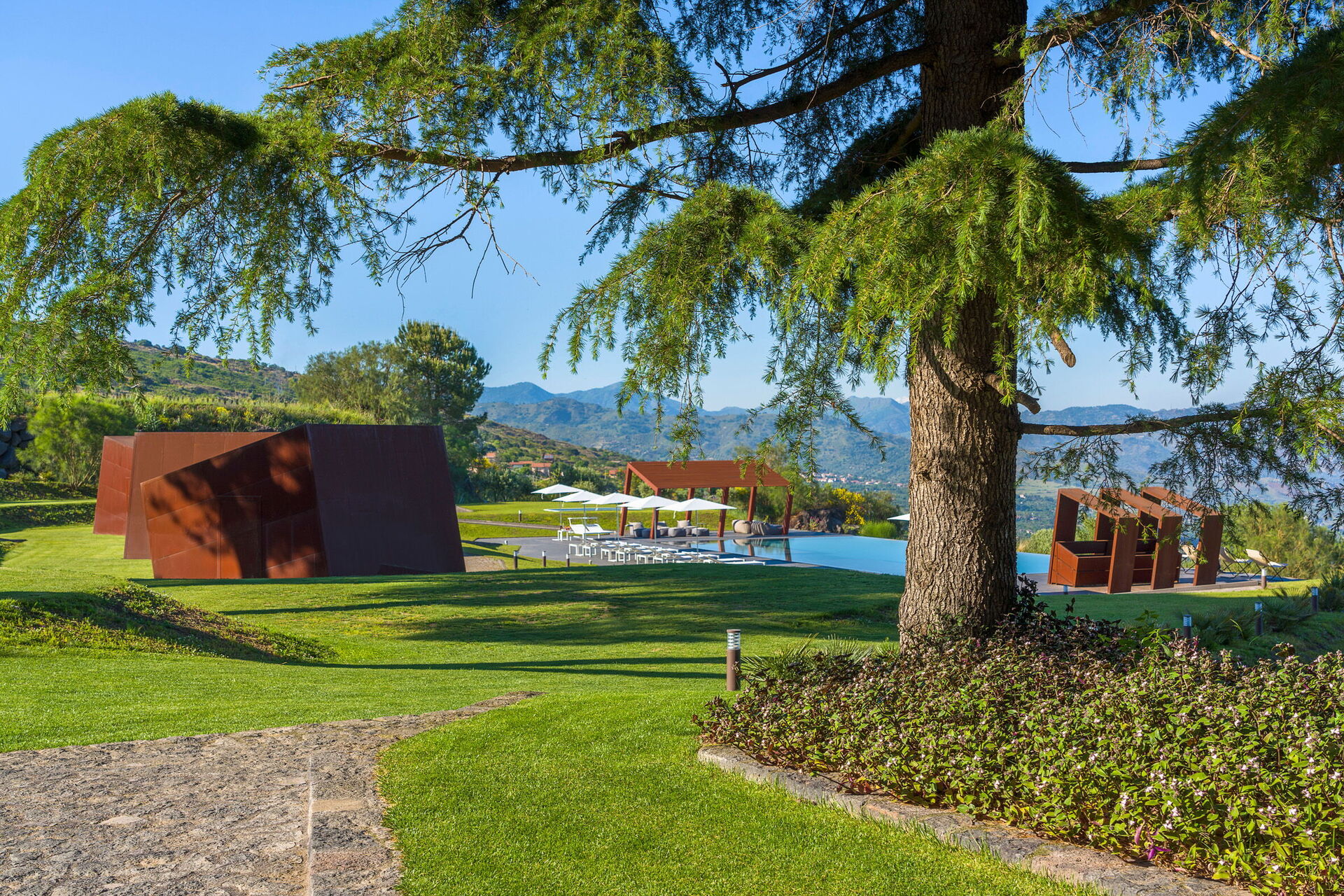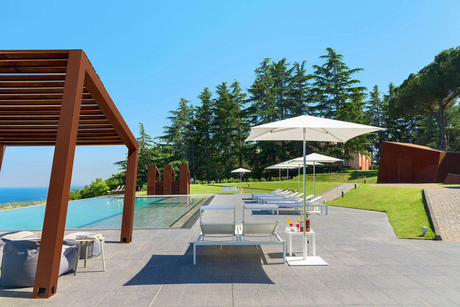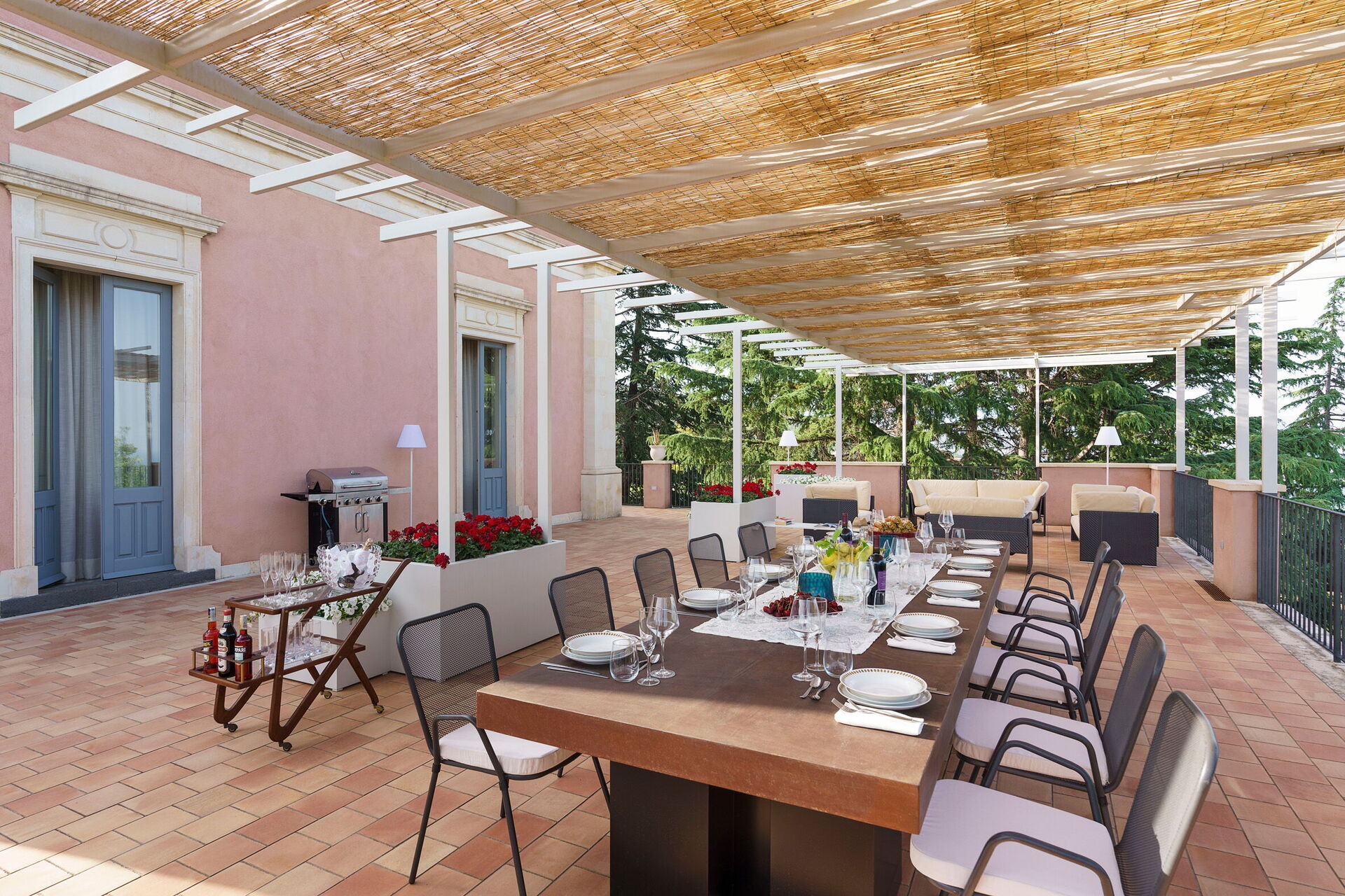 De mange udendørs arealer er perfekte til udendørs spisning, til at nyde en aperitif eller middag på sommeraftener og til at beundre den fantastiske panoramaudsigt.