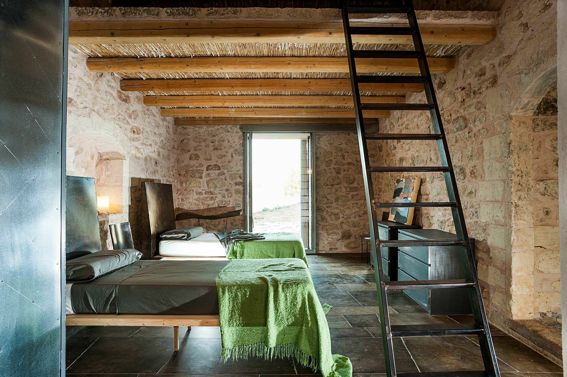 Inside, the villa combines natural stone walls with refined touches of steel and wood, complemented by stylish designer furnishings that create a luxurious yet rustic ambiance.