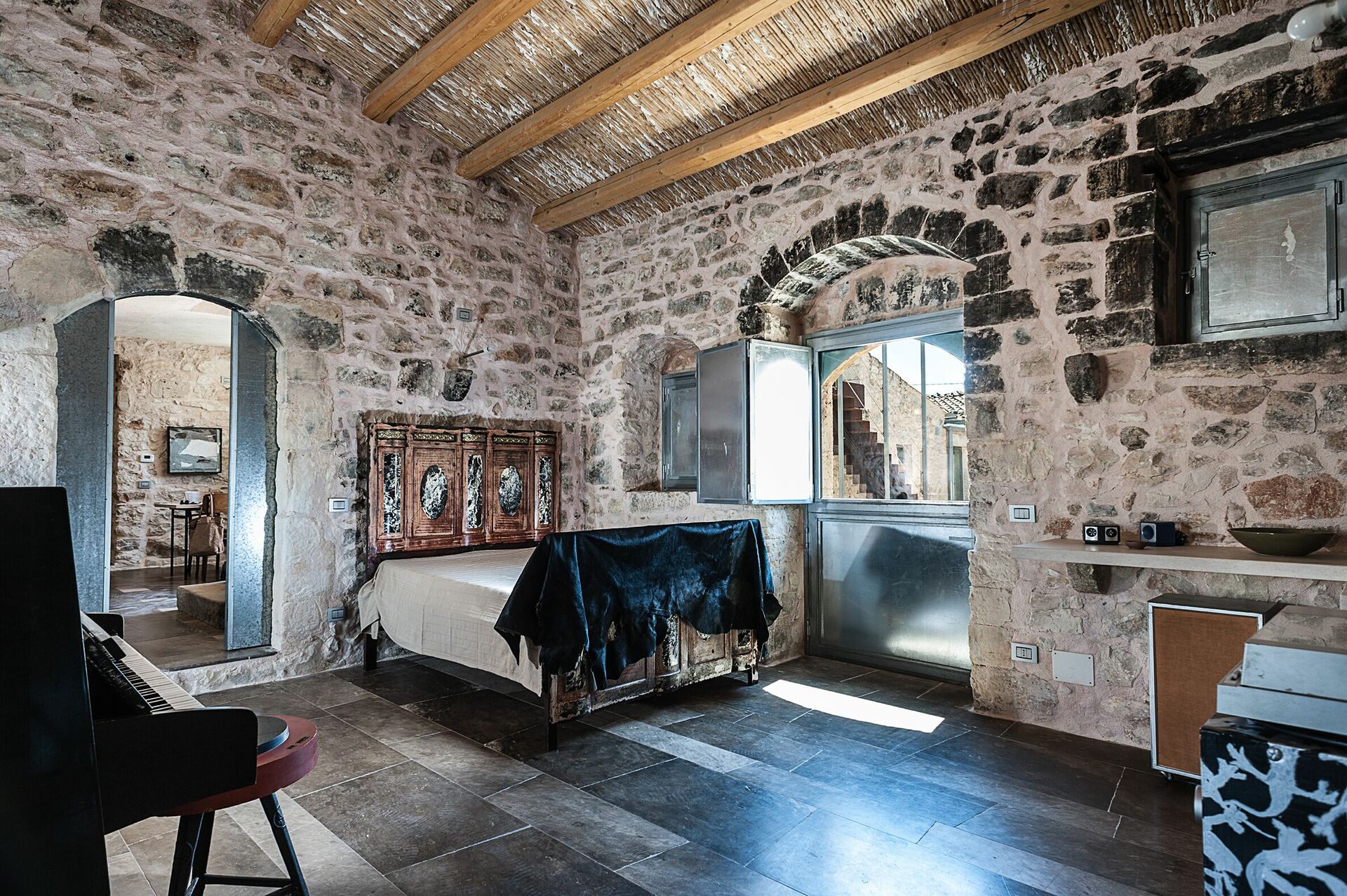 Recently renovated, the villa has been transformed into an exclusive private residence and artists’ studio, preserving its rustic charm while offering modern comfort. Traditional stone walls enclose the property, creating a peaceful and authentic Sicilian atmosphere.