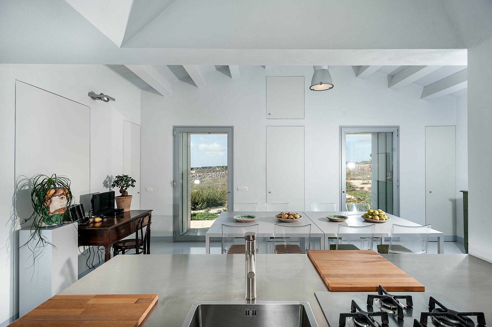 There is one floor of comfortable interiors which open toward the outside, and are tastefully furnished with attention to detail, and antique pieces of family furniture paired with some design pieces.
