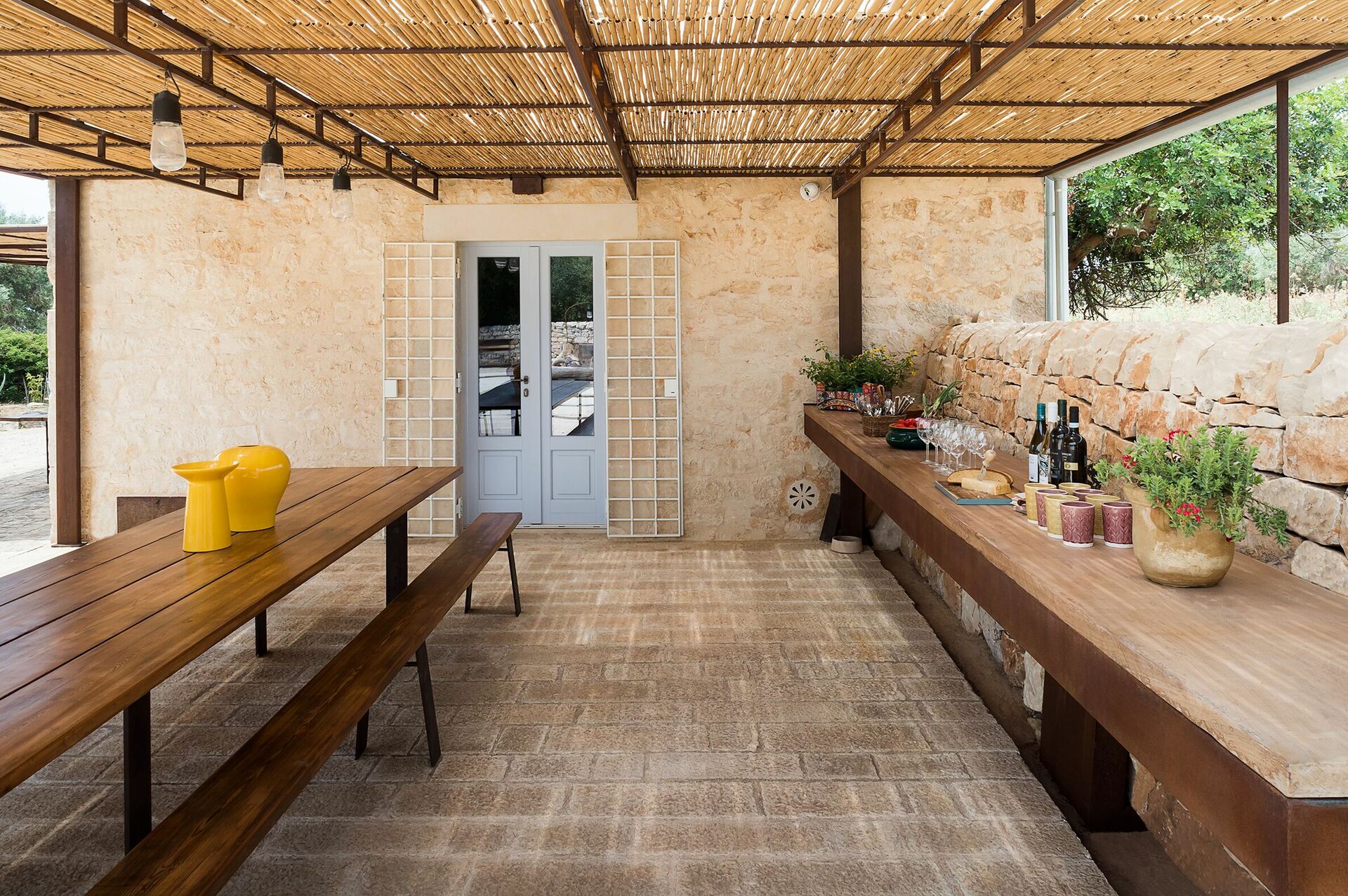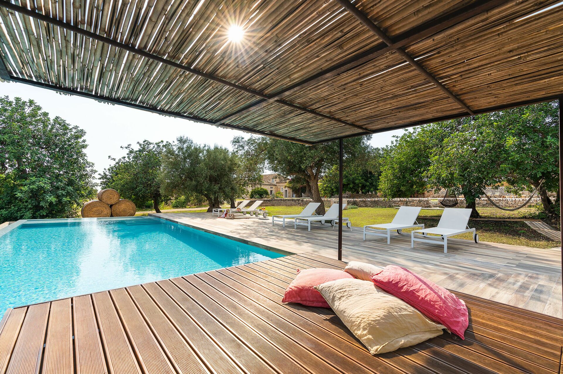 A natural park with picturesque, traditional dry stone walls surrounds Villa Dimora Pura. Outside there is a beautiful garden, and various terraces furnished with tables, chairs and a pergola for enjoying al fresco meals. A large private pool just for guests is equipped with sun beds and umbrellas: it’s the perfect place for cooling off and relaxing on hot summer days with family and friends.